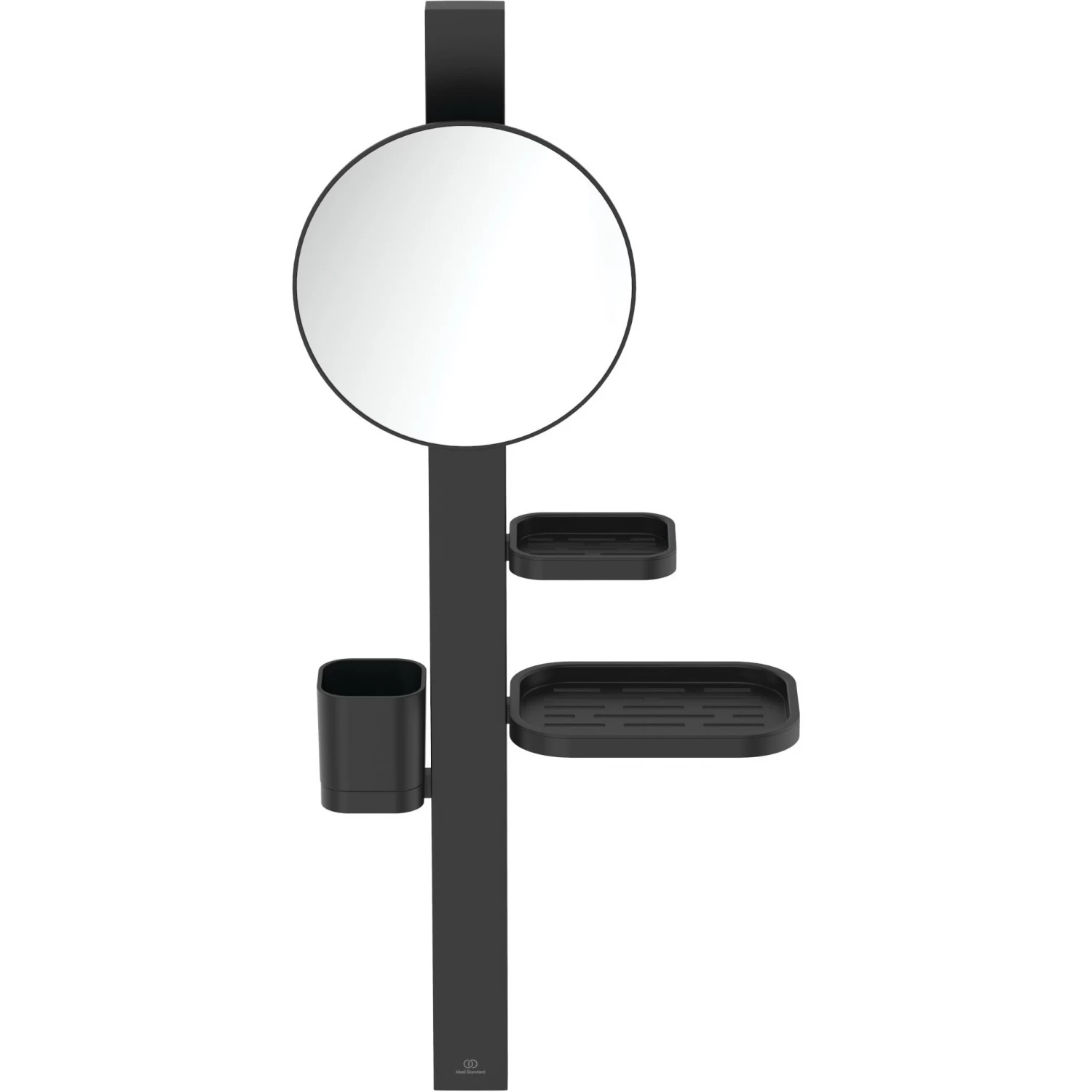 Стойка с мыльницей и зеркалом и стаканом для зубных щеток, материал алюминий, цвет чёрный матовый.