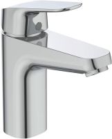 Однорукоятковый смеситель для раковины, система монтажа EASY-FIX (облегченный монтаж), литой излив, длина излива 110 мм, аэратор Perlator с ограничением потока 5 л/мин., керамический картридж FirmaFlow 38 м, с функцией HWTC (ограничение максимальной температуры горячей воды), без функции CLICK, металлическая рукоятка с индикаторами горячей / холодной воды, гибкая подводка G3/8" (антибактериальные шланги PEX), шланги стандартной длины 400 мм, без донного клапана.