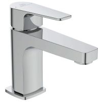 CERAFINE D Однорукоятковый смеситель для раковины, картридж 28 мм FirmaFlow с функцией HWTC (ограничение максимальной температуры горячей воды), гибкая подводка G3/8", система монтажа EASY-FIX (облегченный монтаж), аэратор Perlator с ограничением потока 5 л/мин., металлическая рукоятка с индикаторами горячей / холодной воды, без донного клапана.